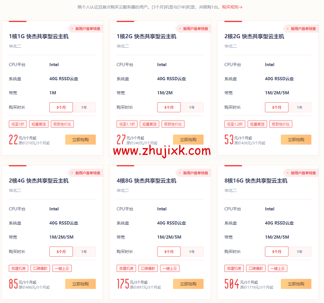 限个人认证且首次购买云服务器的用户。[3 个月]机型与[1 年]机型,共限购 1 台。下面为香港机房价格,台北机房价格也是一样的。