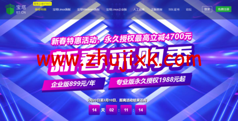 国内知名的宝塔服务器面板厂家,当前正在搞新春特惠活动,就是新春采购季,永久授权最高立减4700元,宝塔企业版899元/年,专业版永久授权1988元起,活动时间从2月20日到3月10日。而且购买宝塔企业版,赠送SSL证书。可能有人问宝塔免费版不香嘛?!堡塔新春采购季活动入口:堡塔新春采购季 (bt.cn)